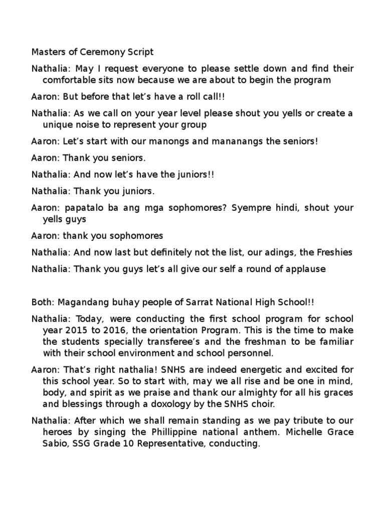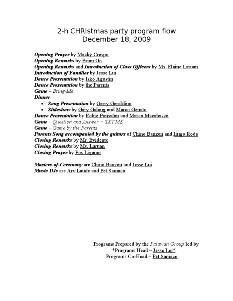 Christmas Party Host Script 2023. This statement will help prepare guests for the formal content of the party. Invitations are available through the National Office (see Resources page) In creating your own invitation, clearly state "A friend will share some inspiring thoughts on Christmas.". M & N: and Good morning classmates, parents and to each one of us. IM DON, AND THIS IS KATHRYN. Sometimes there are circumstances of life that make this season difficult and lonely. BOTH: AND WE ARE YOUR EMCEES FOR TODAY! It is indeed a time for sharing and for parties. A time for sharing, and giving love.