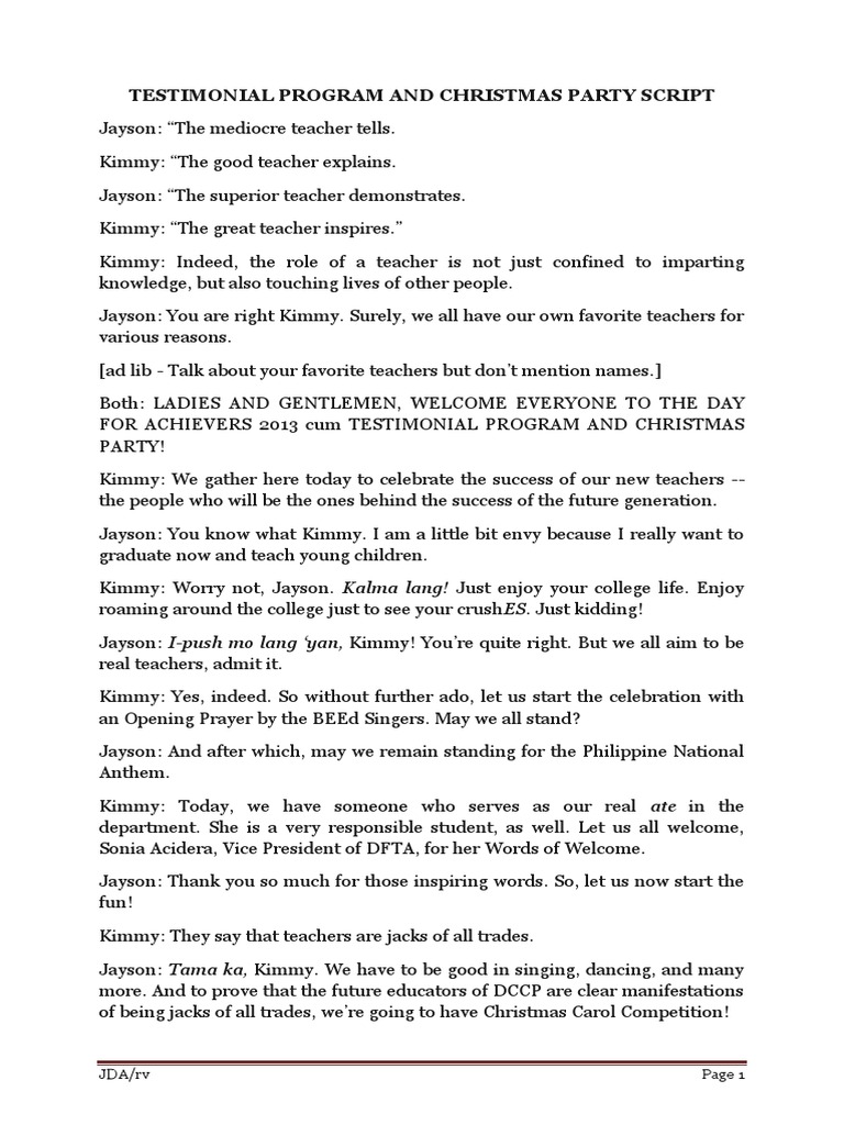 Christmas Party Speech 2023. Here's a sample of a Christmas speech prepared by following a simple step by step speech outline. End with a call to action. It's probably outside of the office, possibly in the evening and everyone is likely to be dressed up with a glass of wine in their hands. Have A Christmas Party To Go With It If you're planning on giving a speech, you should also count on hosting a Christmas office party. Make certain that your Christmas party speech is both concise and memorable. People start preparations for Christmas which is called the advent, and it begins on Sunday of four weeks before Christmas. During this season, let us reflect on the true meaning of Christmas, which is the celebration of the birth of Jesus Christ the Lord. EST THE PRESIDENT: Good afternoon. "How silently, how.